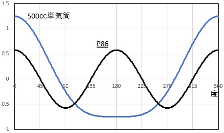 500㏄単気筒の最大一次慣性力(上死点)を1として、500㏄単気筒の一次慣性力+二次慣性力、P86の二次慣性力(一次慣性力はバランサーシャフトで釣り合っている)を求めたのが下のグラフ。
