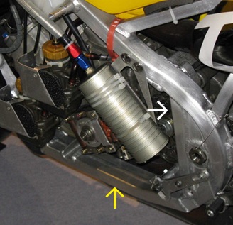 そして、スイングアームピボット部の前が補強されています(白矢印)。フレーム右側ではこの補強はありません。