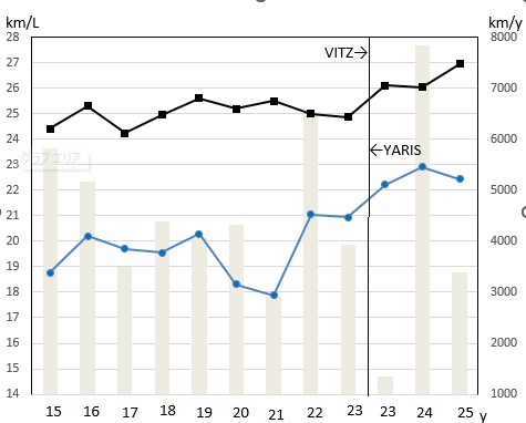 年間平均燃費は、その年の運転パターンによって大きく影響されるので、あくまで参考ですが、各車の年平均値の最高値ではヤリスが1.9km/L高い数字です。