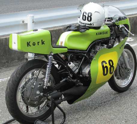 カワサキH1RAS。H1R(500cc2ストローク空冷3気筒)の発展型で、シートレールを低くしたフレーム、長いスイングアームが特徴。このマシンが走行。