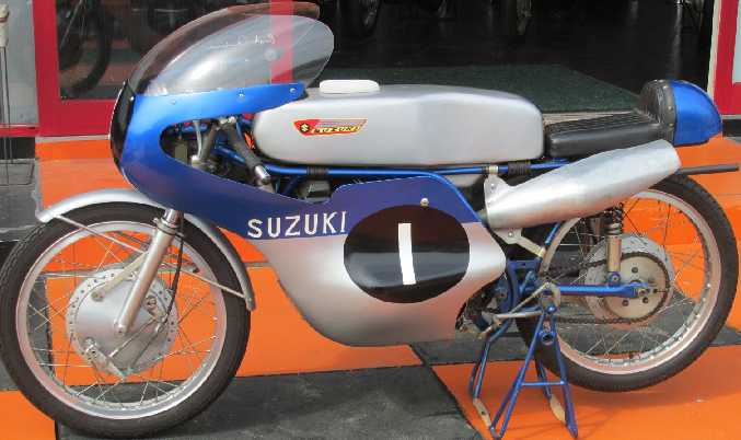 スズキRT66。 1966年型125㏄ファクトリーマシン、2ストローク水冷2気筒、9段変速。フレームはアルミとスチールがあり、これは後者。