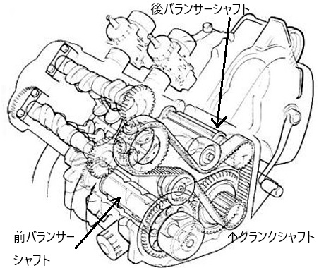 クランクシャフトはカムシャフトにギアで繋がるシャフトをベルトで駆動しますが、同時に後バランサーシャフトを回します。