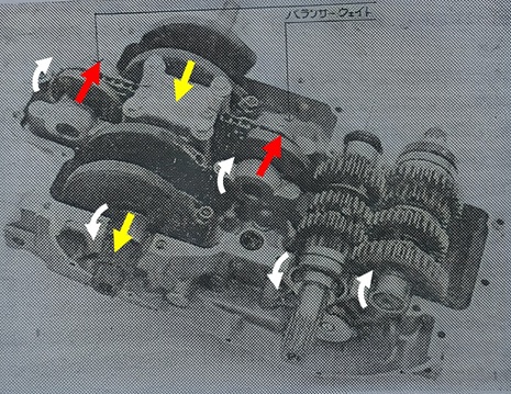 これはアッパークランクケースを下右から見たもので、白矢印は各シャフトの回転方向、黄矢印はピストンが上死点にある時の一次慣性力とクランクバランスウエイト遠心力の合力※、赤矢印はバランサーシャフトのバランスウェイトの遠心力で、一次慣性力がバランサーシャフト等により相殺されています。