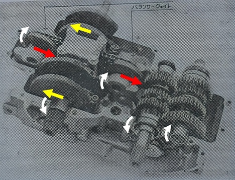 ところがP86では400RSと異なり、上の図で分るように2軸のバランサーシャフトの回転方向が互いに逆です。