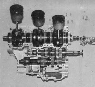 〇動力取出ギアの左側は「並列3気筒」であり、4ストロークならともかく、2ストロークとしてはクランクシャフト長が長い。