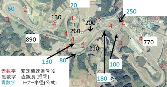 に、鈴鹿サーキットの航空写真に直線長(推定)、コーナー半径(公式)を記入したものを載せていましたが、平忠彦(1986年型YZR500(0W81))のシフト地点(平忠彦写真集 きらめく汗のむこうに(角川書店1987)を参考)を加筆しました。