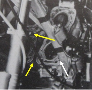 0W60の方がシリンダー間の隙間(白矢印)が大きいこと、スタッドボルトが通る穴の横の小穴(黄色矢印)の位置が少し異なることがわかります。