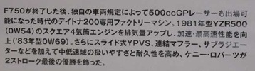0W69のベースとなったマシンを0W54と誤っていますが、1983年型では「~排気量をアップし、加速・最高速性能を向上('83年型0W69)」とし、YPVSについて書かれていないのはこのためでしょう。