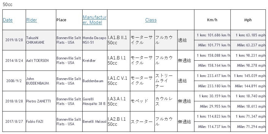 これを参考にFIMの50㏄速度記録についてまとめてみました(クリックすると大きくなります)。